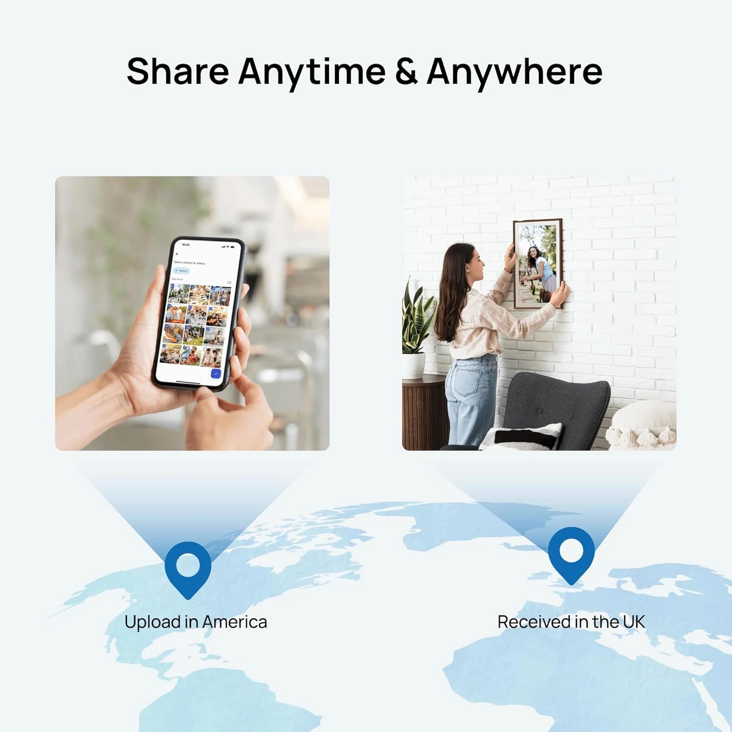 1. Upload photos & videos to your electronic photo frame with no subscription required. Enjoy cloud convenience without SD cards - add memories anytime anywhere from phone to frame, even when it is offline (auto-syncs when reconnected).