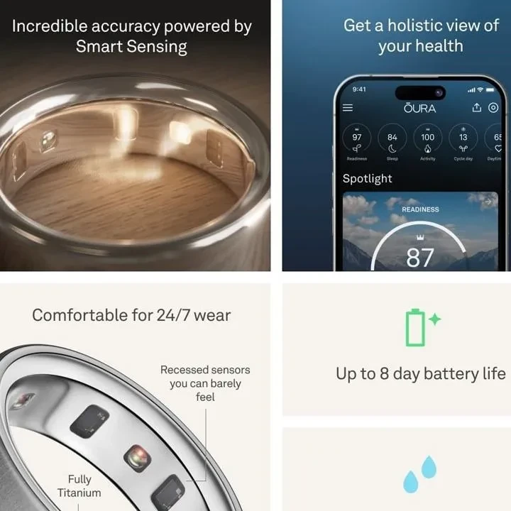 The Oura Ring Gen 4 is a premium wearable designed to deliver accurate, holistic health insights through a sleek, all-titanium smart ring. Featuring its revolutionary Smart Sensing™ technology, recessed sensors, and an extended battery life of up to 8 days, it offers sleep, recovery, and wellness tracking in a comfortable and durable form.