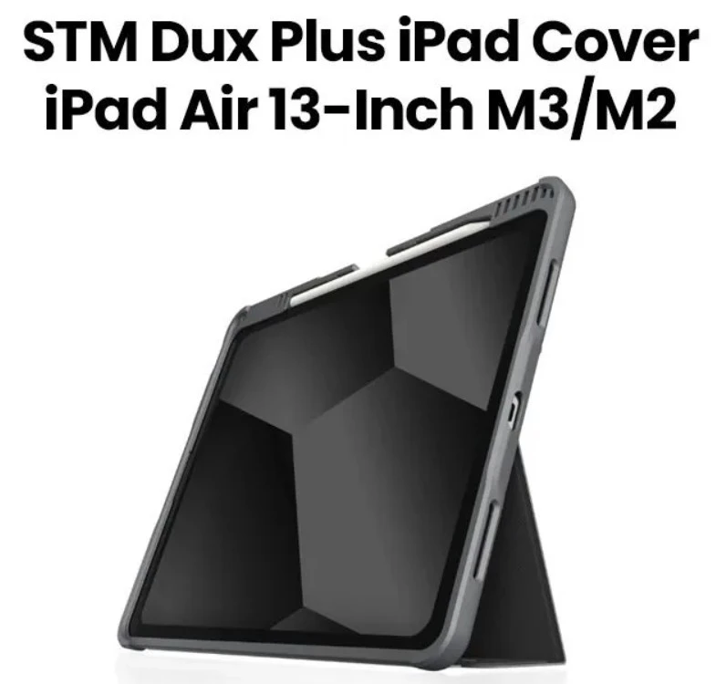 The STM Dux Plus iPad Cover for iPad Air 13" M3/M2 (2025/2024) combines rugged durability with everyday usability. Engineered to deliver military-grade drop protection, it features reinforced corners, a transparent back panel, and a slim folio design. With full Apple Pencil support and a professional Black finish, it’s the ideal case for students, professionals, and creatives who need reliable protection with functional style.